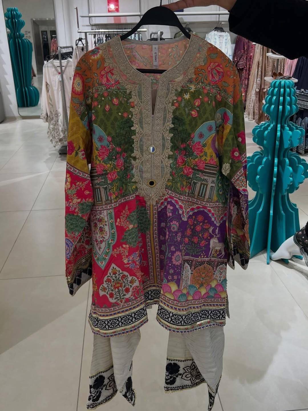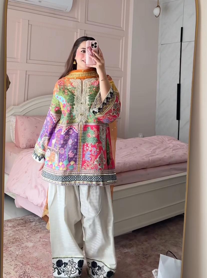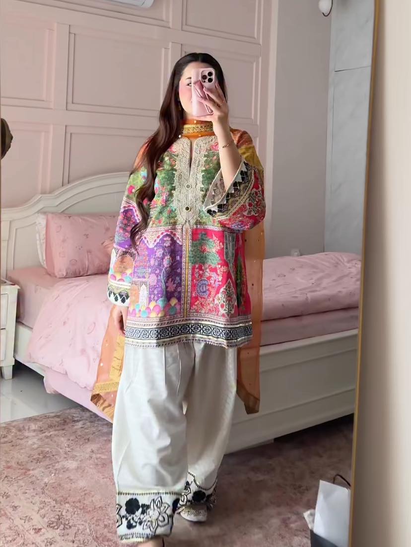 Capture the essence of a modern sunset with this striking rust-red embroidered suit. The shirt features playful geometric motifs and a contemporary collared neckline, perfectly balanced by voluminous off-white pleated shalwar, gathered around hem. It’s a spirited, high-fashion ensemble that marries traditional artistry with a bold, avant-garde silhouette for the trendsetting woman. -Brick Red Color -Stitched Article -3 Piece