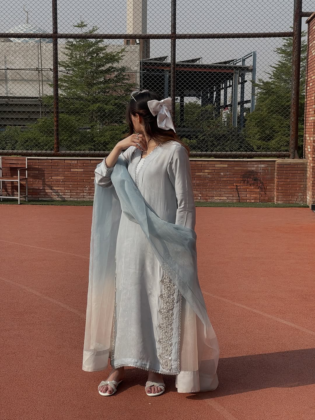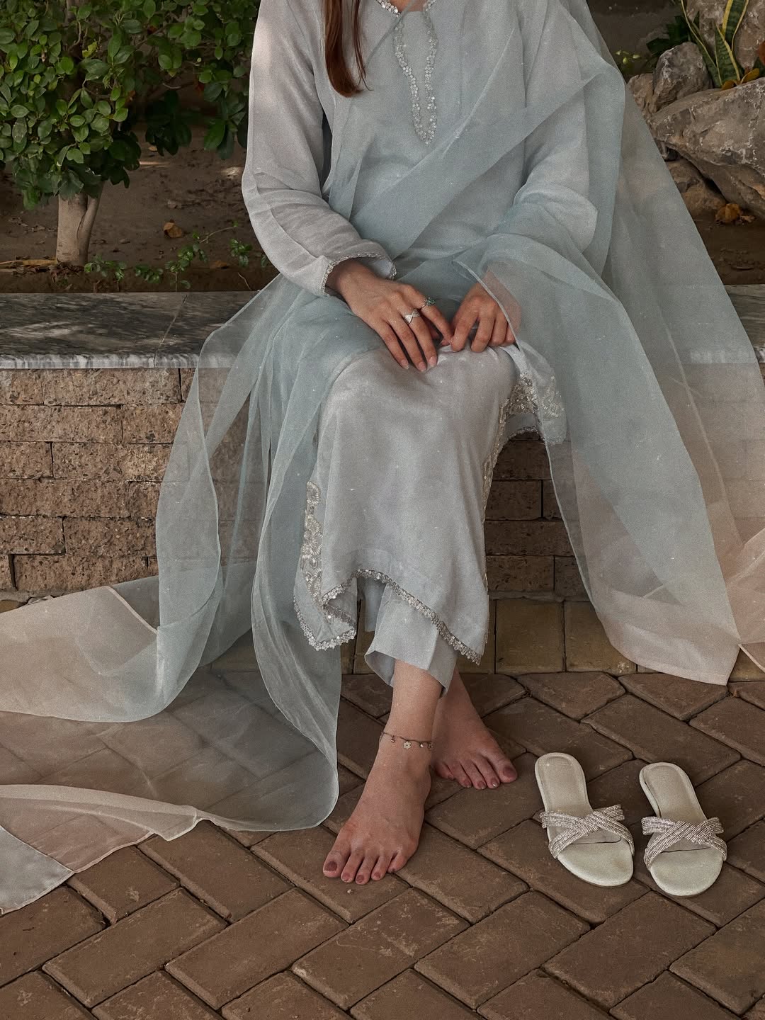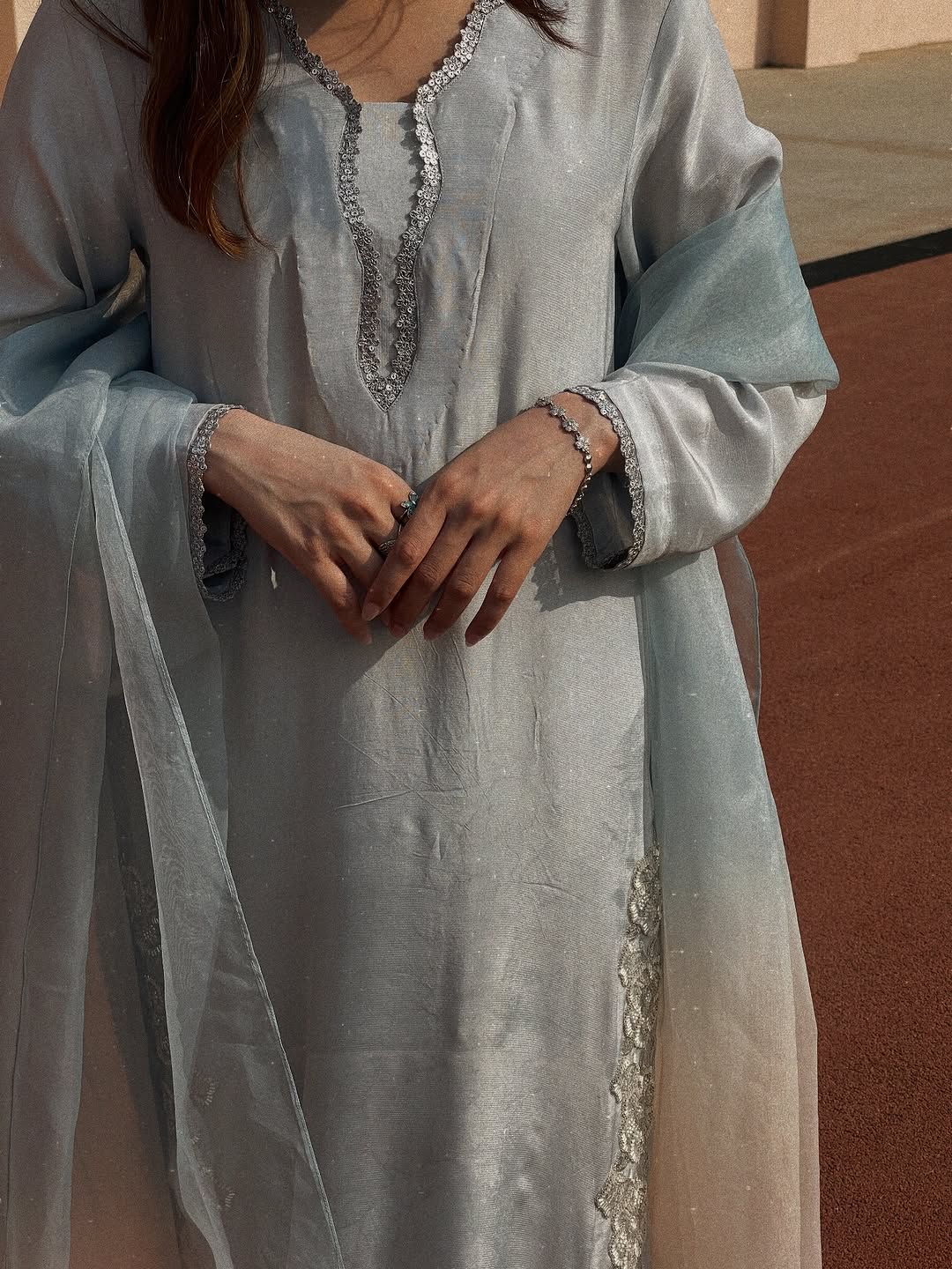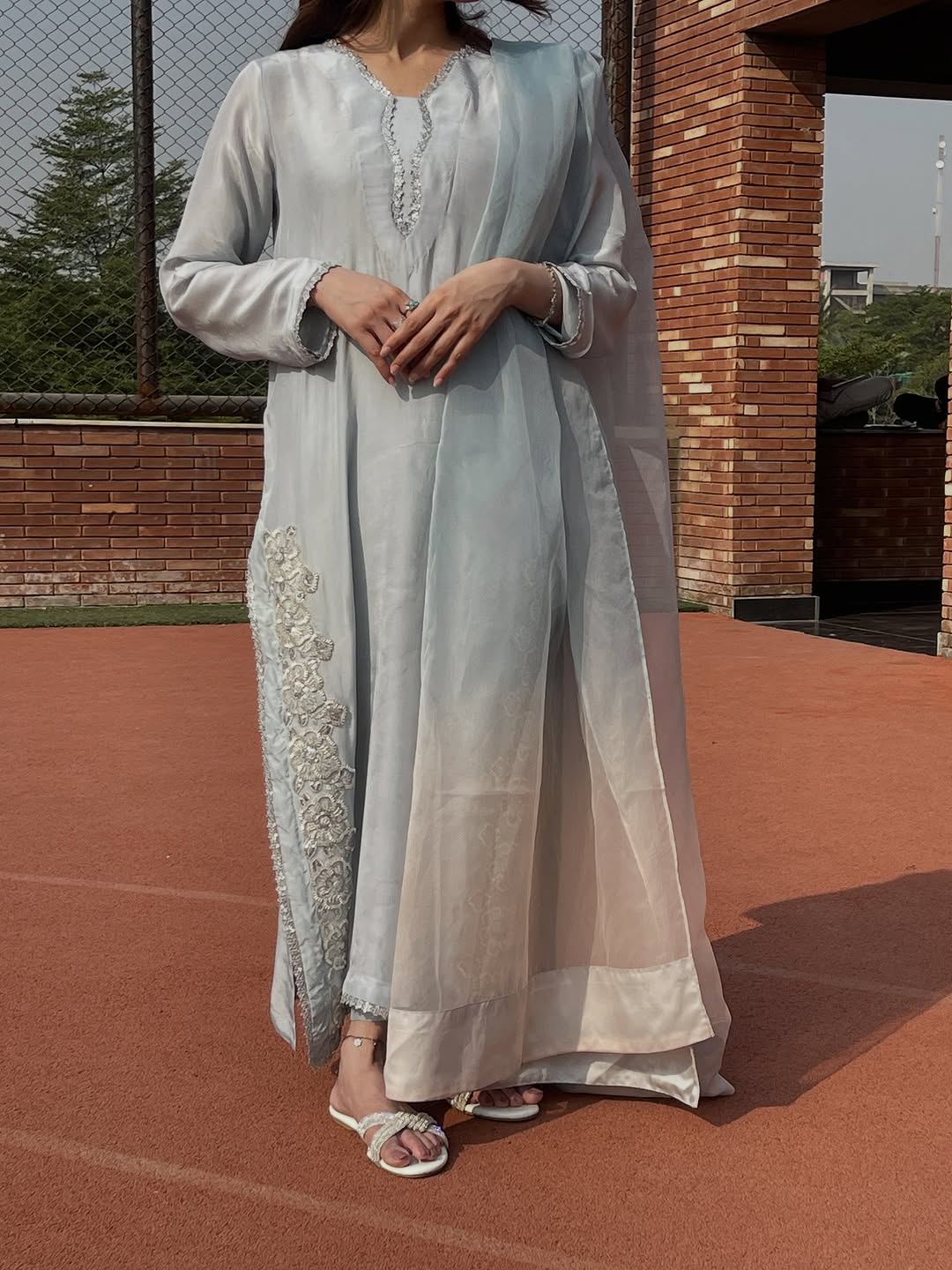 A refreshing take on tradition, this green block-printed shirt crafted from Korean raw silk exudes effortless charm. Styled with matching Korean raw silk pants and a delicate pure organza dupatta, it’s a perfect blend of classic craft and modern grace.