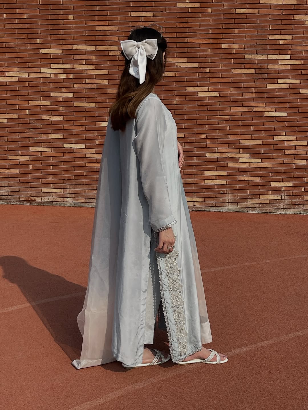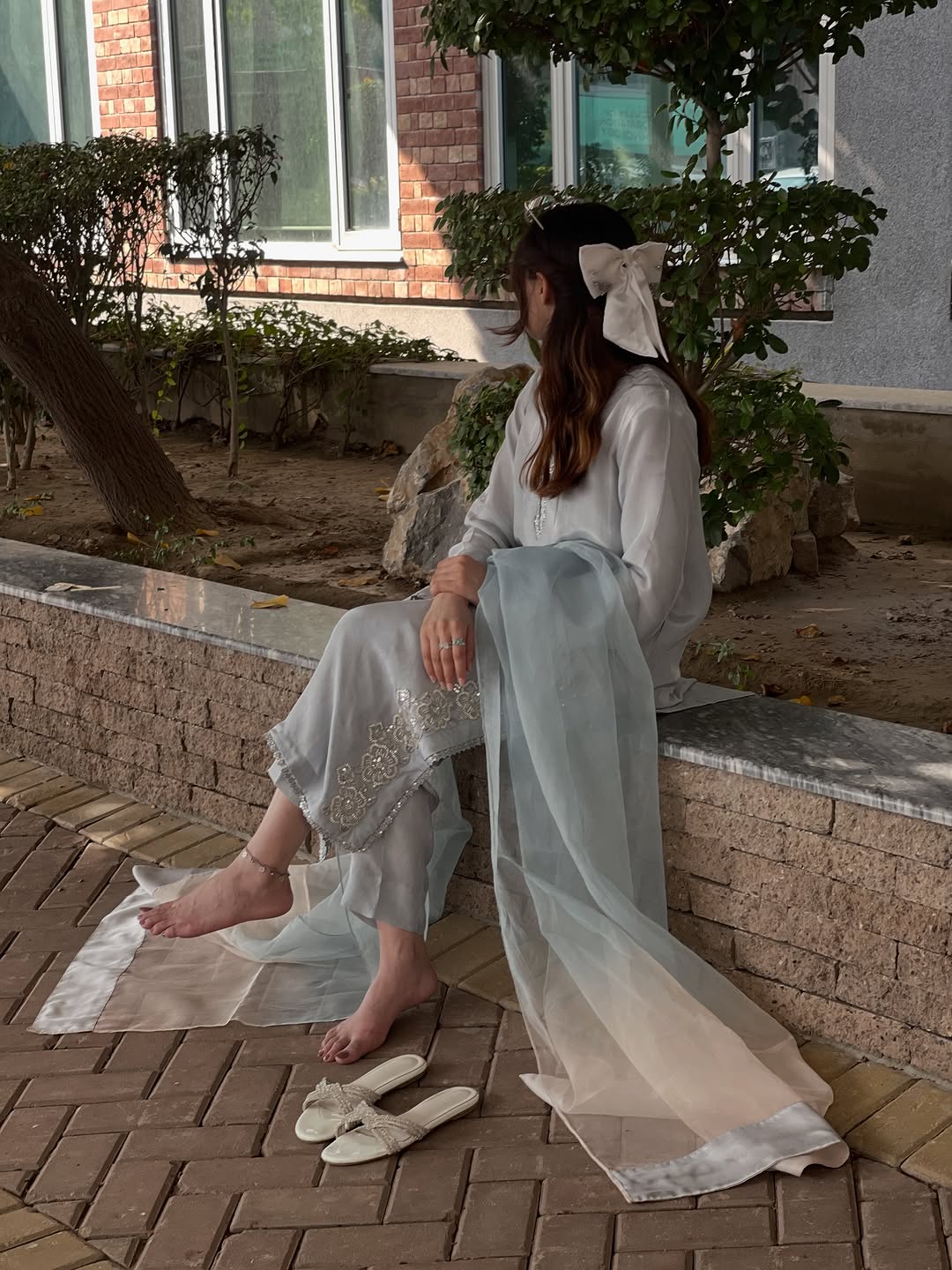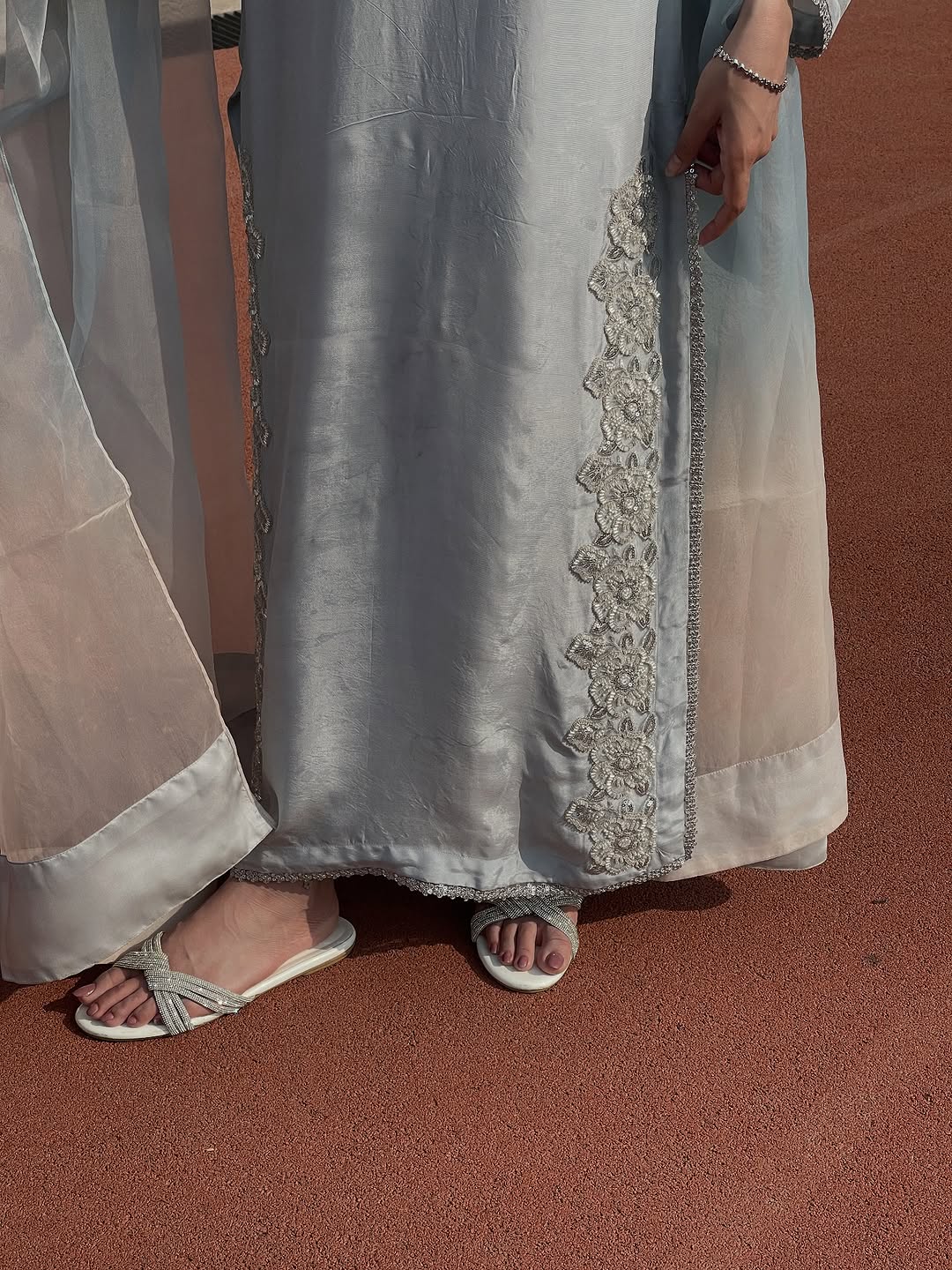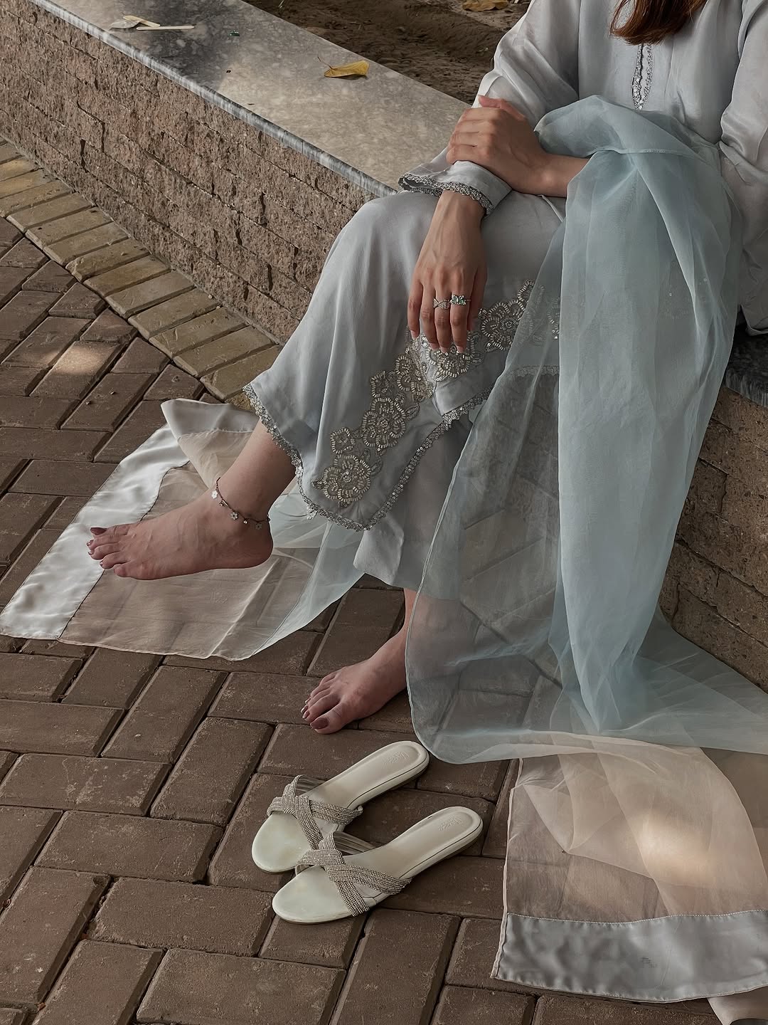A refreshing take on tradition, this green block-printed shirt crafted from Korean raw silk exudes effortless charm. Styled with matching Korean raw silk pants and a delicate pure organza dupatta, it’s a perfect blend of classic craft and modern grace.