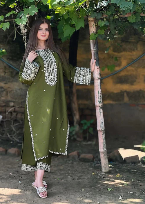 This exquisite Daily/Basic Wear kurta set is perfect for your summer wardrobe. Crafted from soft cotton in a refreshing olive green hue, the long kurta features intricate embroidery for a touch of elegance. Paired with straight cotton trousers, this 2-piece set is ideal for all-day comfort and style