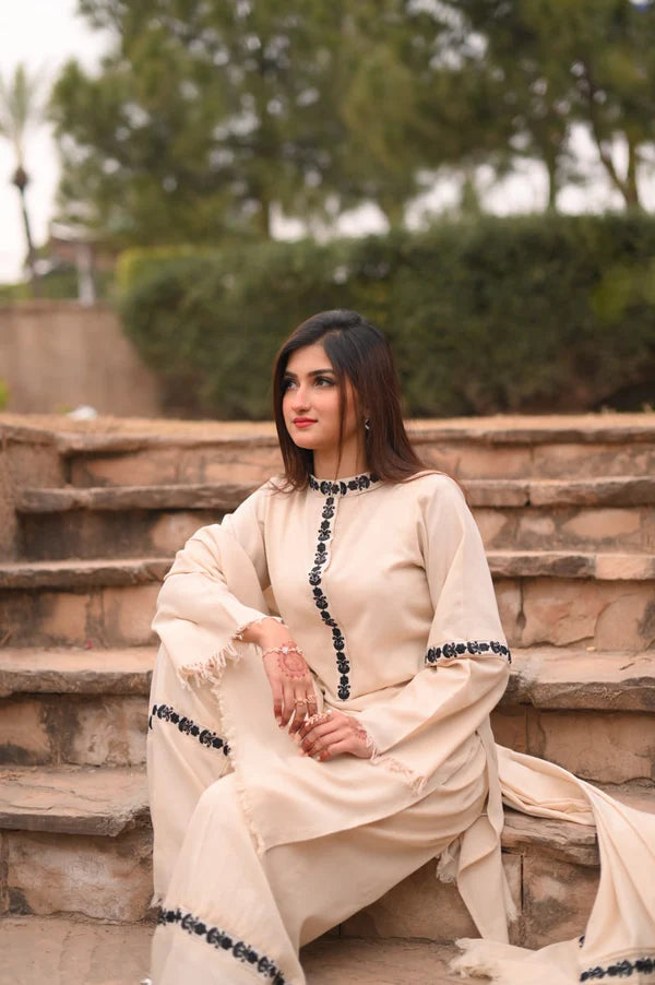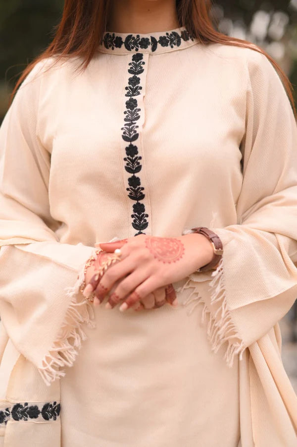 Shirt: Premium poly wool fabric with embroidery-ready neckline and sleeve detailing.